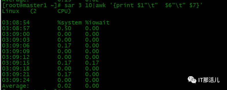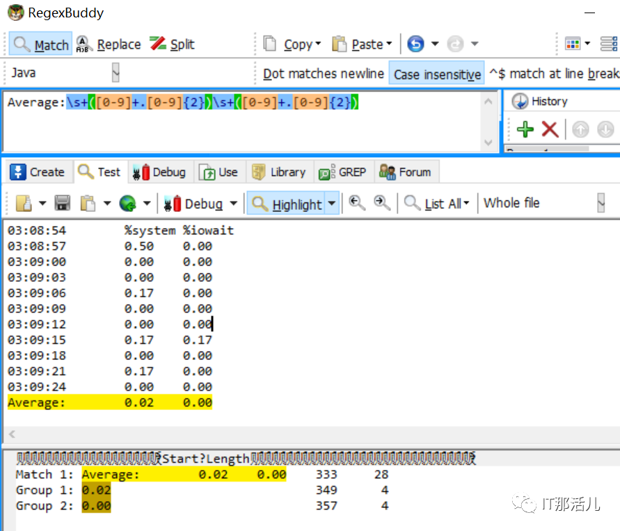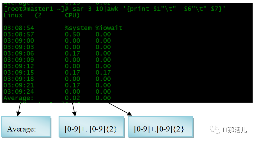 如上述的正則表達式匹配Avarage一行中的%system和%iowait數(shù)值。