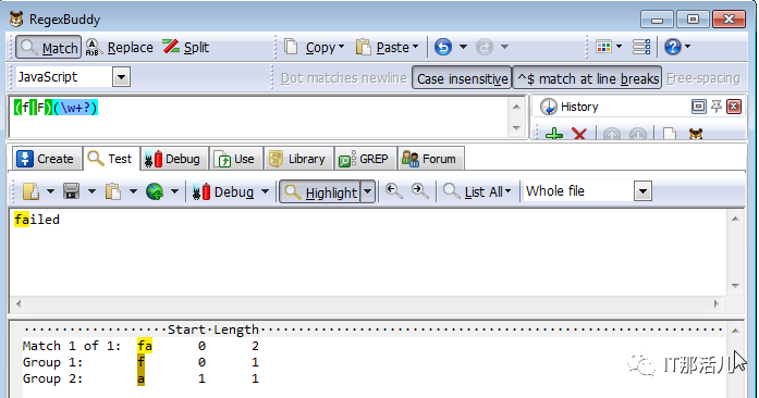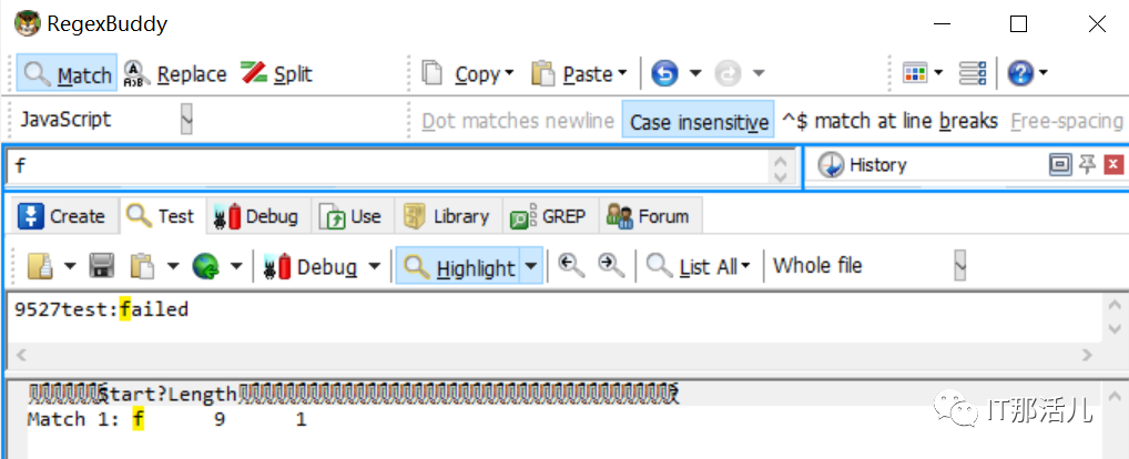 表達式 "f",在匹配字符串 " 9527test:failed " 時,匹配結果如下圖: