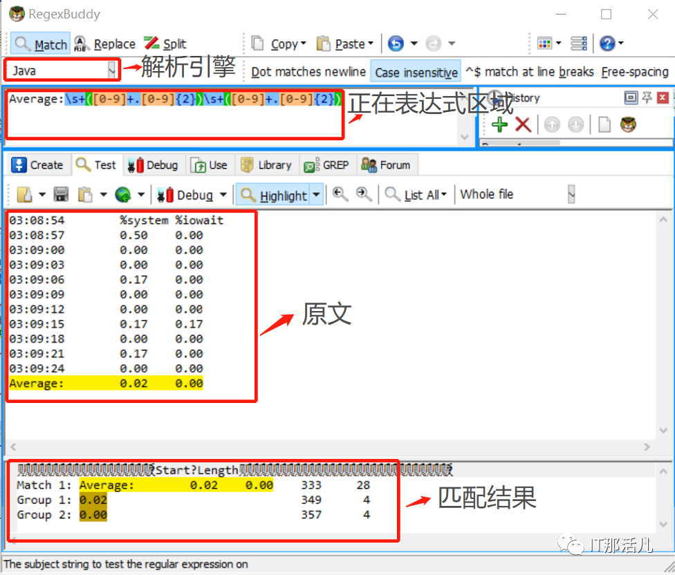 這里需要匹配Average一行的%system列的值0.02以及%iowait的值0.00,這里可以用如下正則表達式寫法: