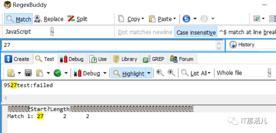 表達式 "27",在匹配字符串 " 9527test:failed" 時,匹配結果如下圖: