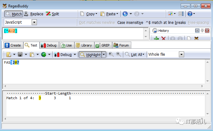 表達式 "[^A-Z]",在匹配字符串 "FAS3207" 時,只能匹配其中任意一個字符(3或者2或者0或者7),匹配結果如下圖: