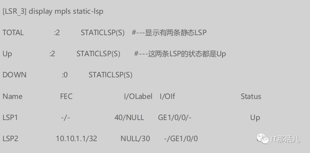 配置完成后,可在各節(jié)點執(zhí)行display mpls static-lsp命令查看靜態(tài)LSP狀態(tài),這里以LSR_3為例。