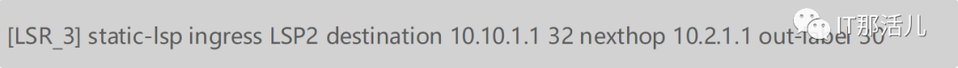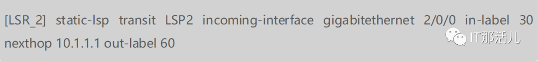 Transit LSR_2上的配置。配置入接口、入標(biāo)簽(30,要與LSR_1的出標(biāo)簽一致)、下一跳和出標(biāo)簽(假設(shè)為60)。