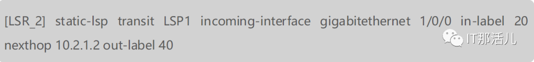 Transit LSR_2上的配置。配置入接口、入標(biāo)簽(20,要與LSR_1的出標(biāo)簽一致)、下一跳和出標(biāo)簽(假設(shè)為40)。