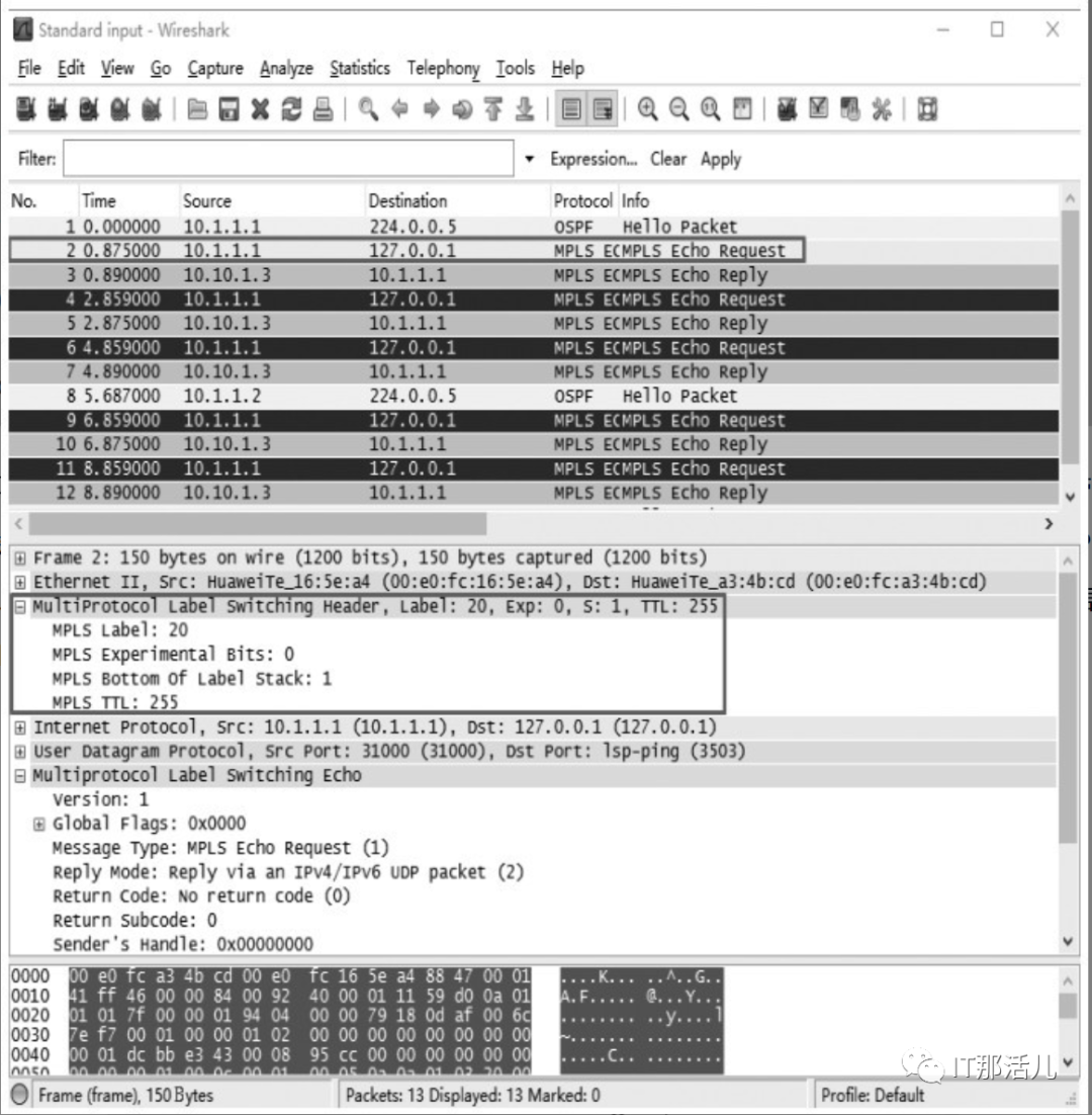 在純 LSP 隧道(非 MPLS VPN 應(yīng)用)中,MPLS最多只會帶一層MPLS標(biāo)簽。先對LSR_2的G0/0/0端口在LSR_1 ping LSR_3時進(jìn)行抓包,隨便找一個抓取的MPLS報文,均發(fā)現(xiàn)其中只有一層MPLS標(biāo)簽(圖中的“Mutiprotocol Label Switching Echo”是回顯信息,是該MPLS報文的真正數(shù)據(jù)部分)。