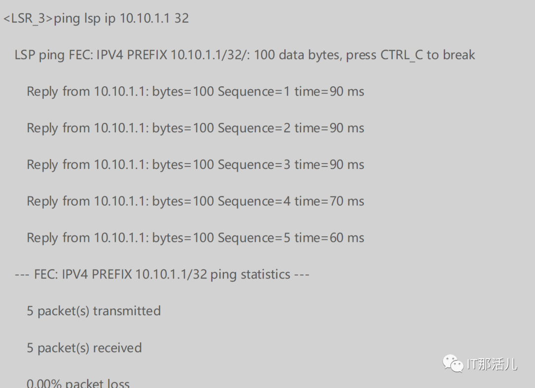 此時,在LSR_3上執(zhí)行ping lsp ip 10.10.1.1 32命令,Ping到達(dá)LSR_1 Loopback1接口IP地址的LSP是通的,測試結(jié)果如下所示。