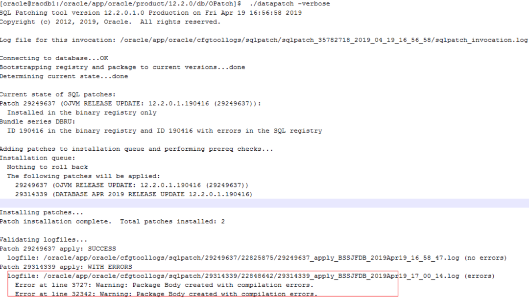 su - oracle cd /oracle/app/oracle/product/12.2.0/db/OPatch ./datapatch -verbose |